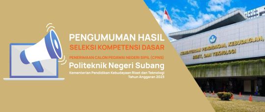 Berikut kami sampaikan informasi terkait Hasil Seleksi Kompetensi Dasar (SKD) Calon Pegawai Negeri Sipil (CPNS) di Lingkungan Politeknik Negeri Subang Kementerian Pendidikan Kebudayaan Riset dan Teknologi Tahun Anggaran 2023.