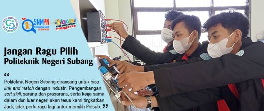 Also for the Subang State Polytechnic, currently there are four study programs that are ready to accept students from the SNMPN entry route, namely the Information Systems D-III study program, the Agroindustry D-III study program, the Mechanical Maintenance D-III study program, and the D-III Nursing study.